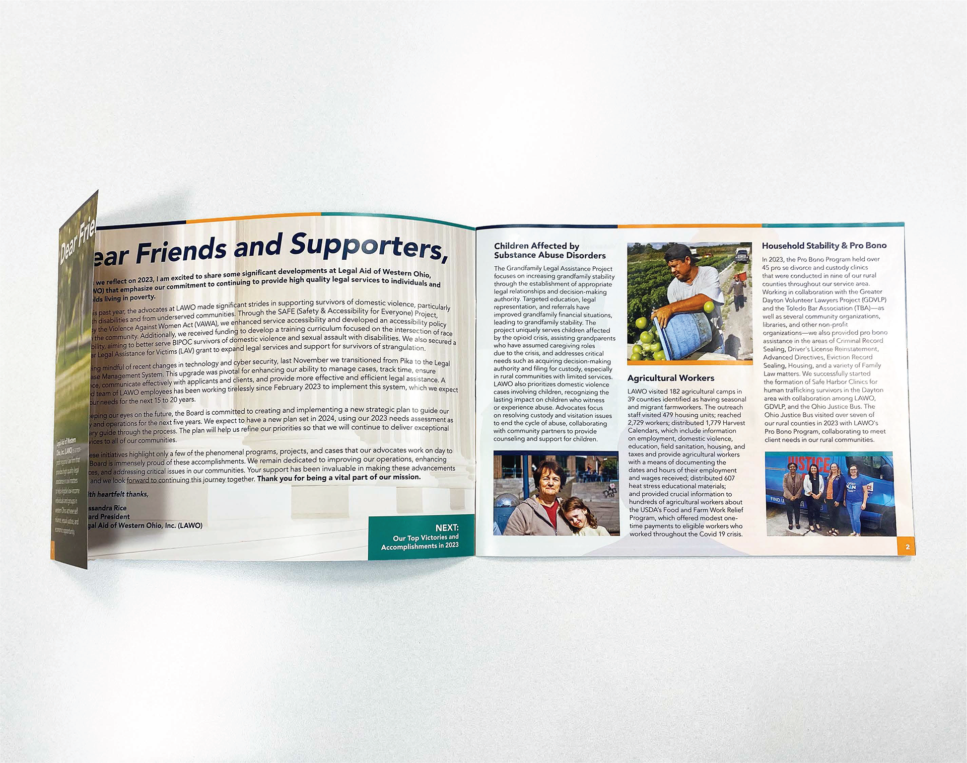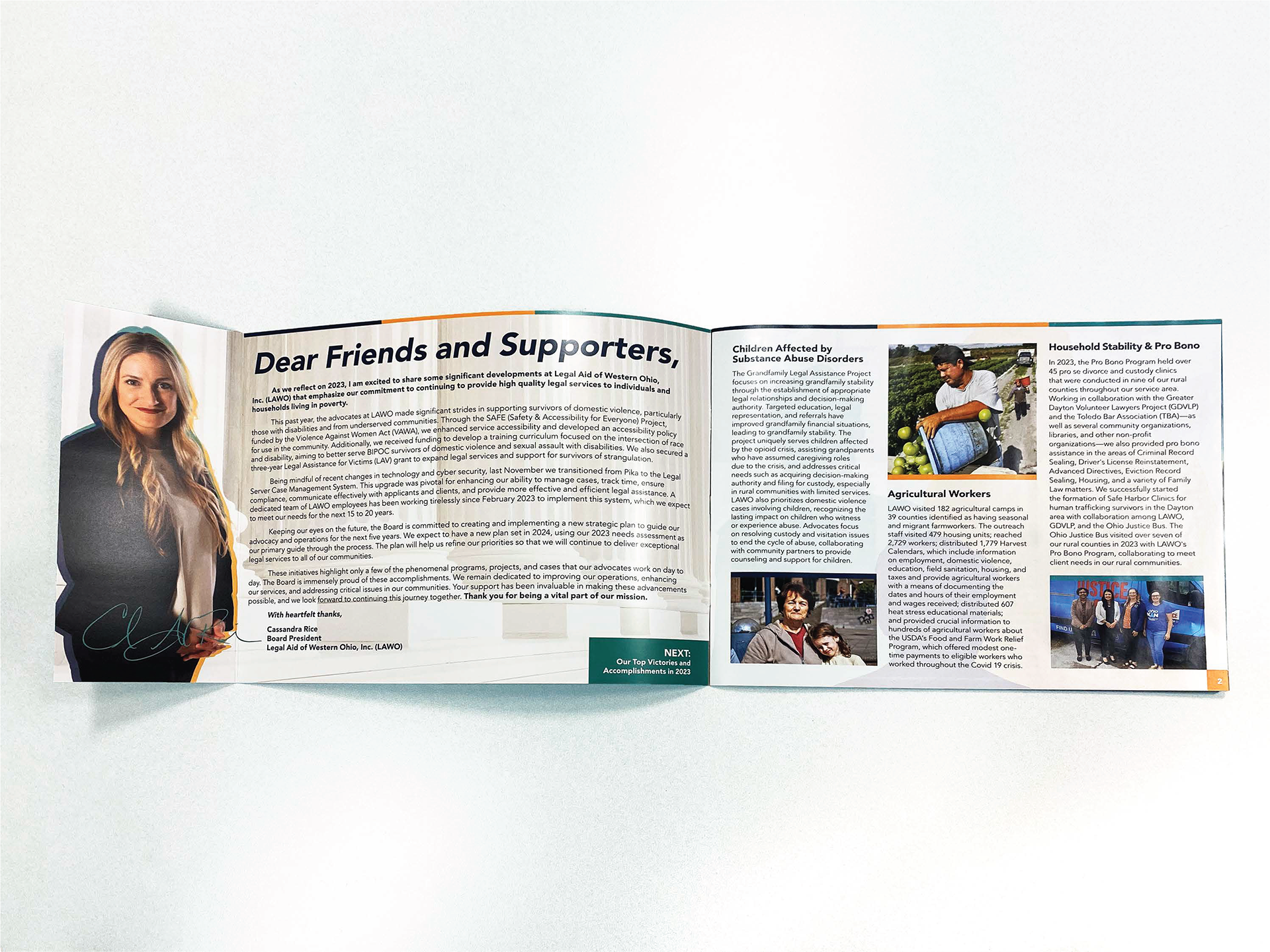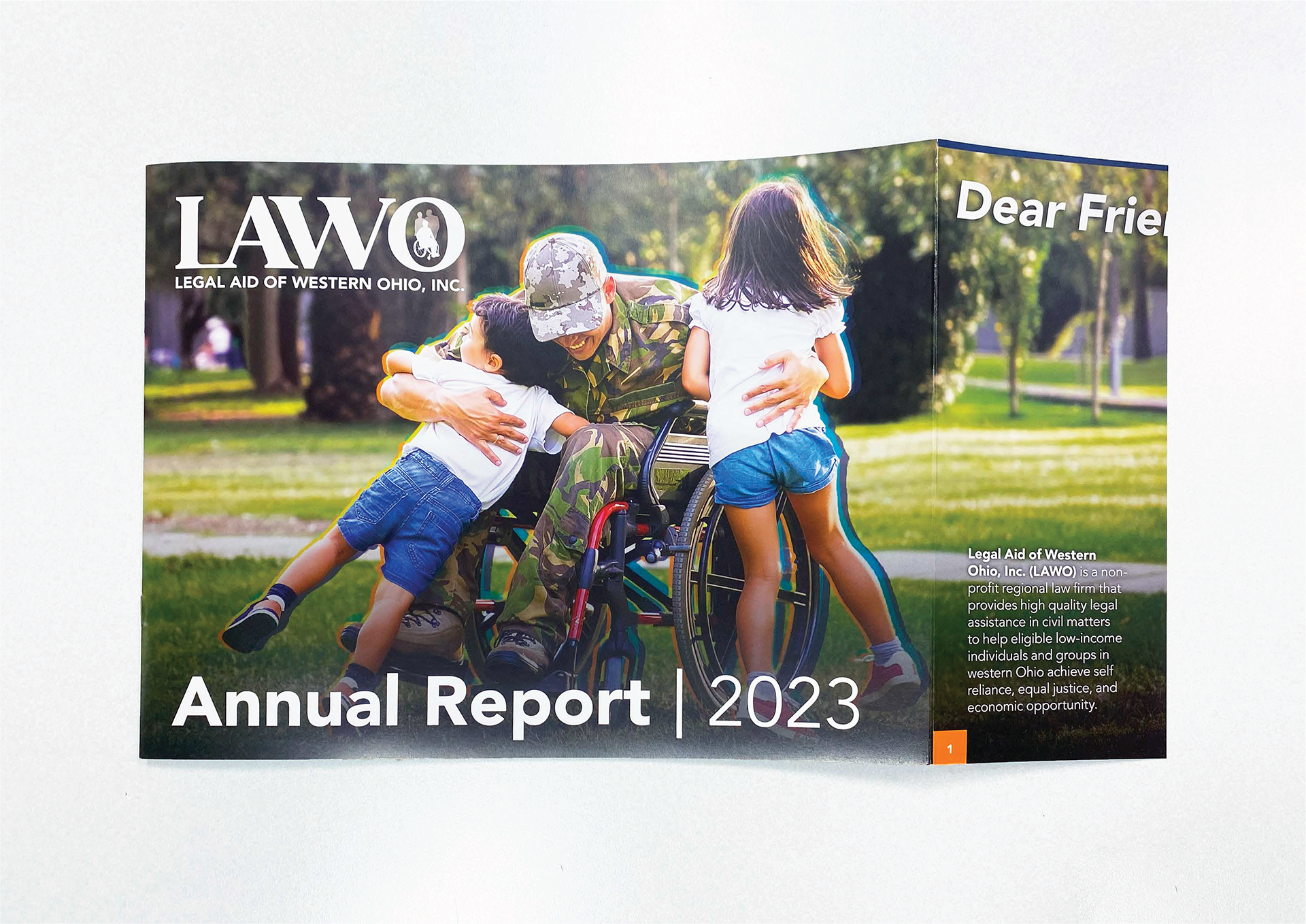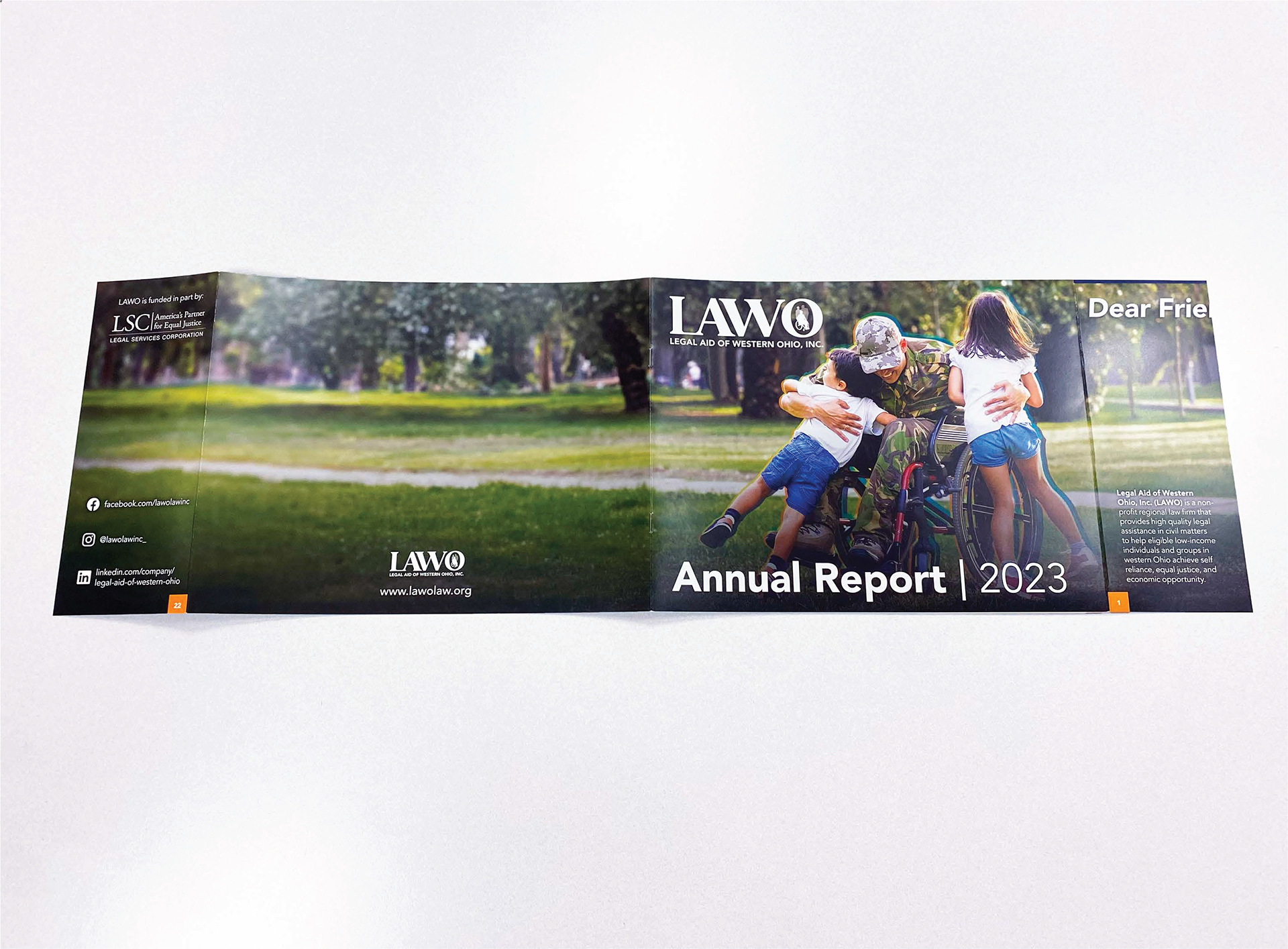 LAWO 2023 annual report. 4-color offset, saddle stitch with french folds. 2024