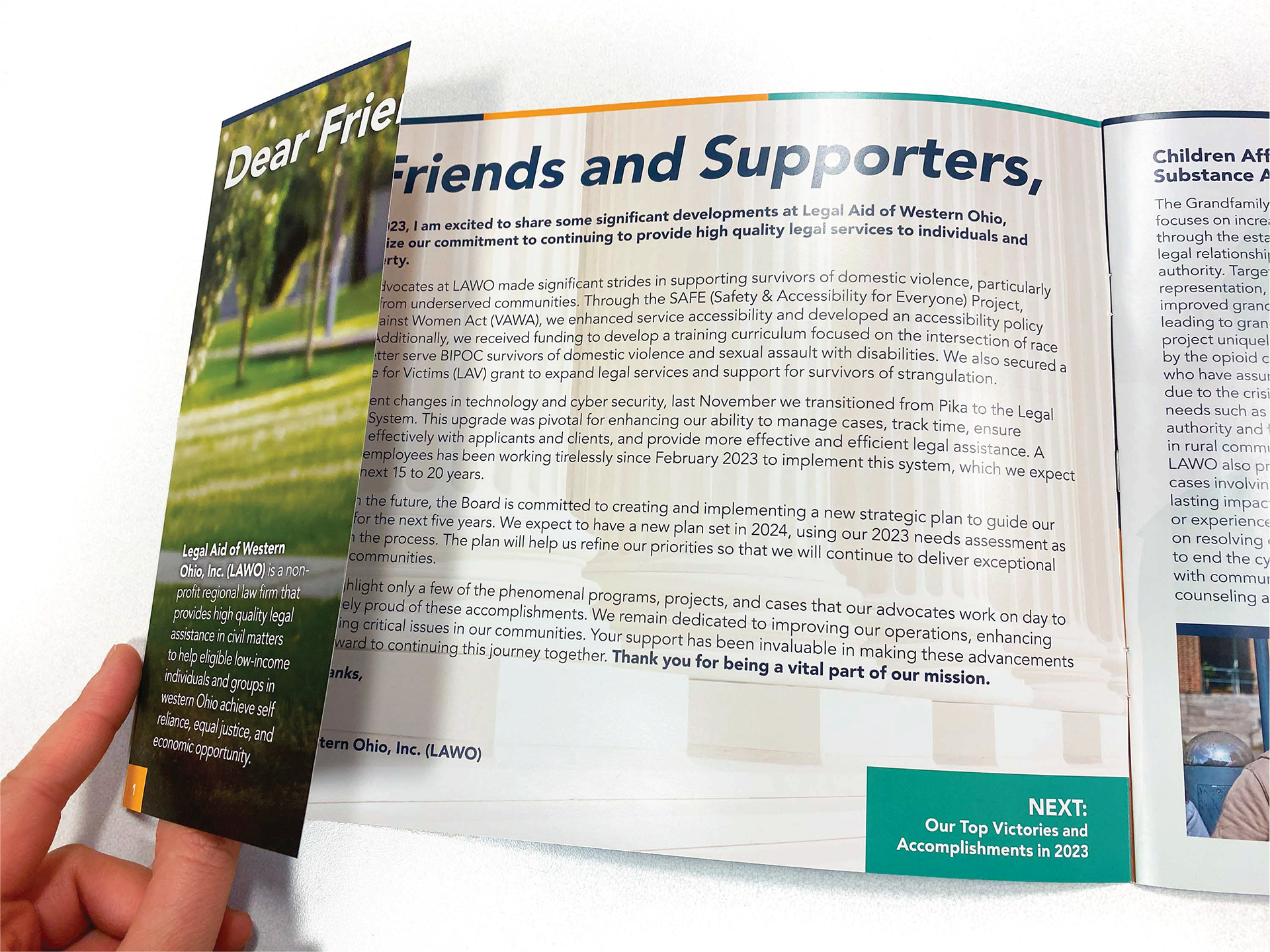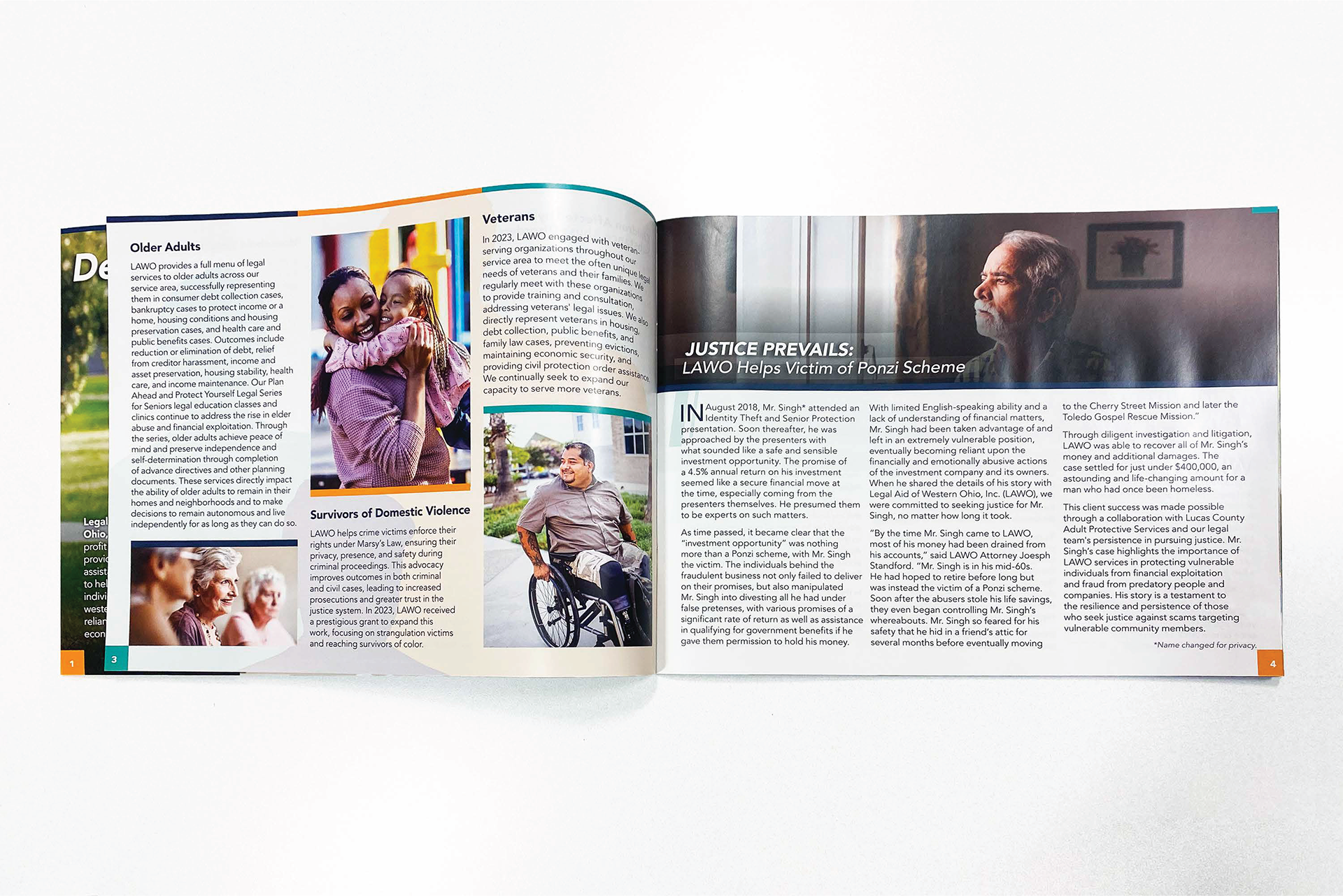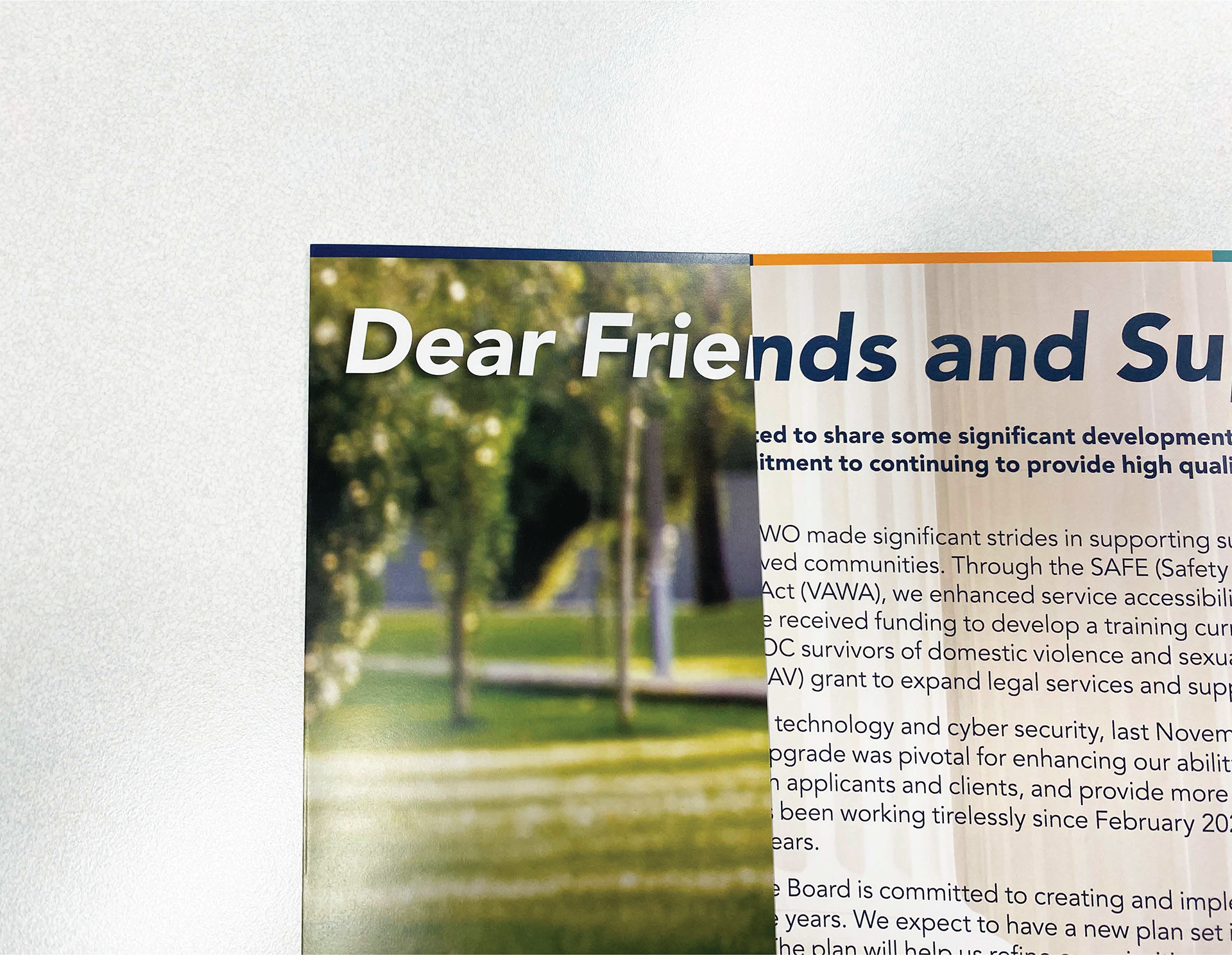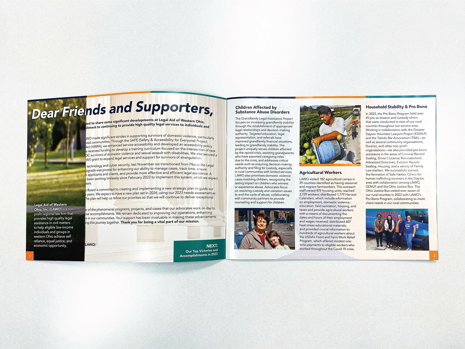 LAWO 2023 annual report. 4-color offset, saddle stitch with french folds. 2024